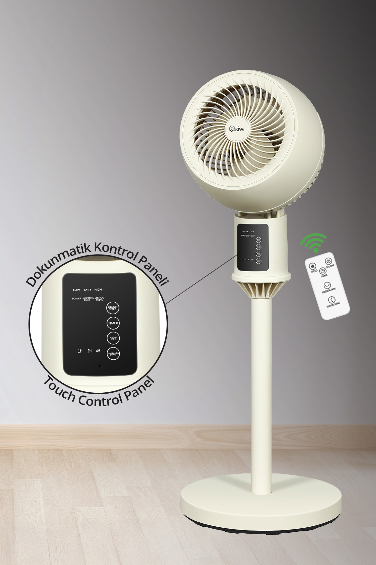 3 kademeli kontrol. Dokunmatik ekranlı ve uzaktan kumandalı. Yüksek rüzgar hızı ve düşük gürültü. Geniş Hava Dağıtımı.1-7 saat arası zamanlayıcı. 90° Otomatik Dikey salınım, 60° Otomatik Yatay salınım. 82 cm yükseklik. 3 adet kanat. Yüksek rüzgar hızı ve düşük gürültü.Geniş Hava Dağıtımı. Ağır ve satabil ayak.