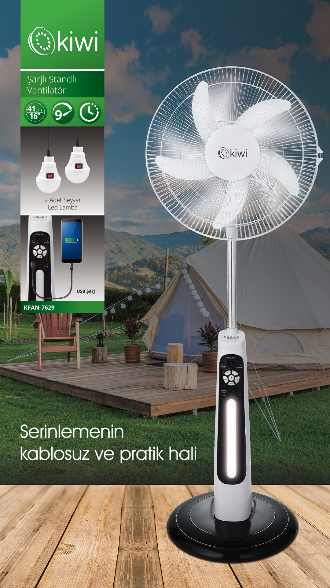 9 hız kontrolü. AC/DC Çalışma işlevi. 0,5 saatlik zamanlayıcı. Cep telefonu için 5V USB Çıkışı, 16V DC Güç girişi/SMD Gece Lambası.12V 5AH Kurşun-asit Pil. Çalışma Süresi: 3-9 Saat. Şarj Süresi:AC kablosuyla 10-12 Saat. Aksesuarlar: 2 adet seyyar led lamba.